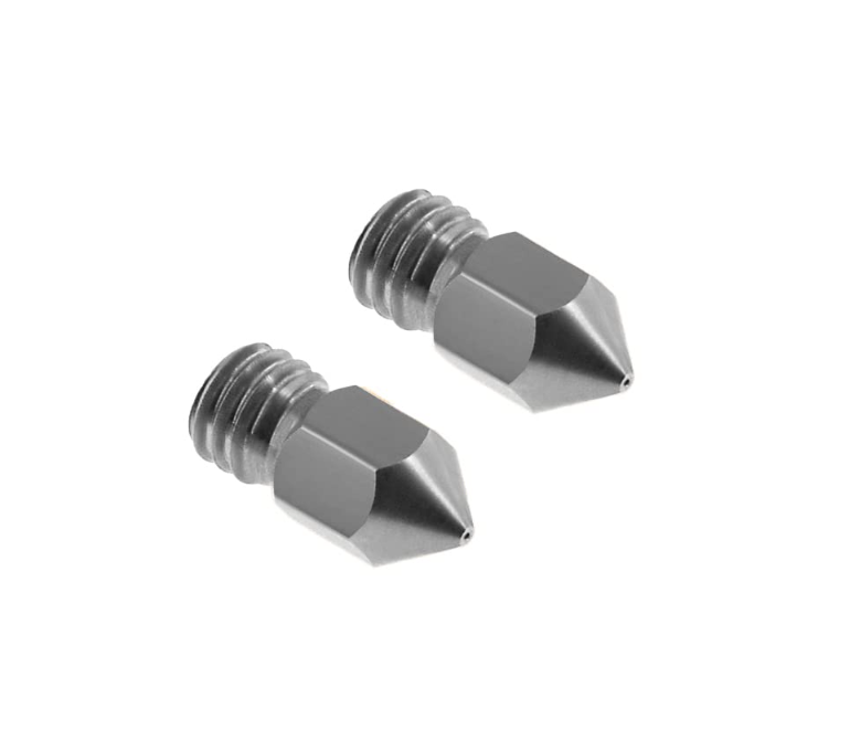 Está hechas de acero inoxidable. Especialmente en el caso de filamentos de metal, carbono, madera o fluorescentes, estas boquillas de acero inoxidable son más resistentes y, por lo tanto, más duraderas que las boquillas de latón habituales. Tienen una calidad superior.